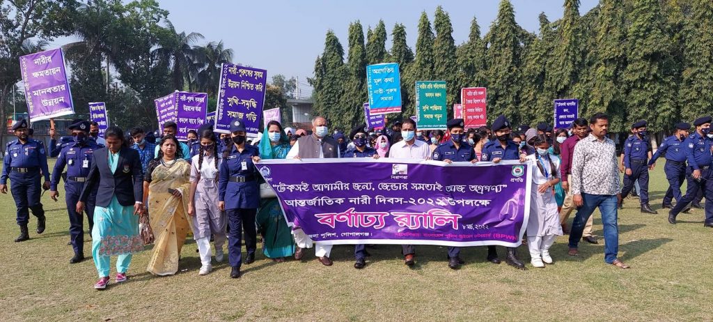 গোপালগঞ্জে আন্তর্জাতিক নারী দিবস -২০২২ উপলক্ষে জেলা পুলিশের আয়োজনে বর্ণাঢ্য র্যালী ও আলোচনা সভা অনুষ্ঠিত হয়েছে। “টেকসই আগামীর জন্য, জেন্ডার সমতাই আজ অগ্রগণ্য” -এ প্রতিপাদ্যে বাংলাদেশ পুলিশ উইমেন নেটওয়ার্ক (BPWN) -এর সহযোগিতায় আজ মঙ্গলবার সকাল ৯টায় গোপালগঞ্জ জেলা পুলিশ লাইনের মোড় থেকে জেলা পুলিশ সুপার আয়েশা সিদ্দিকা বিপিএম,