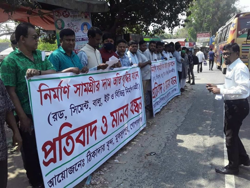 ইট, বালু, রড, সিমেন্ট, পাথর, বিটুমিন সহ বিভিন্ন নির্মাণ সামগ্রীর লাগামহীন ঊর্ধ্বগতির প্রতিবাদে রোববার (২০ মার্চ) বেলা ১১টায় ঢাকা-খুলনা মহাসড়কের মুকসুদপুর  কলেজ মোড় নামক স্থানে মুকসুদপুর উপজেলার সকল স্তরের ঠিকাদাররা সম্মিলিতভাবে মানববন্ধন করেছে।