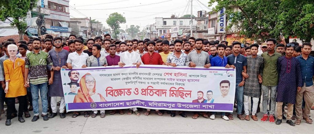 মাননীয় প্রধানমন্ত্রী ও আওয়ামী লীগ সভানেত্রী জননেত্রী শেখ হাসিনাকে নিয়ে কটুক্তি করায় কেন্দ্রীয় ছাত্রদলের সাধারণ সম্পাদক সাইফ মাহমুদ জুয়েলের শাস্তির দাবিতে মণিরামপুর উপজেলা ছাত্রলীগের উদ্যোগে প্রতিবাদ সমাবেশ ও বিক্ষোভ মিছিল অনুষ্ঠিত হয়েছে।
