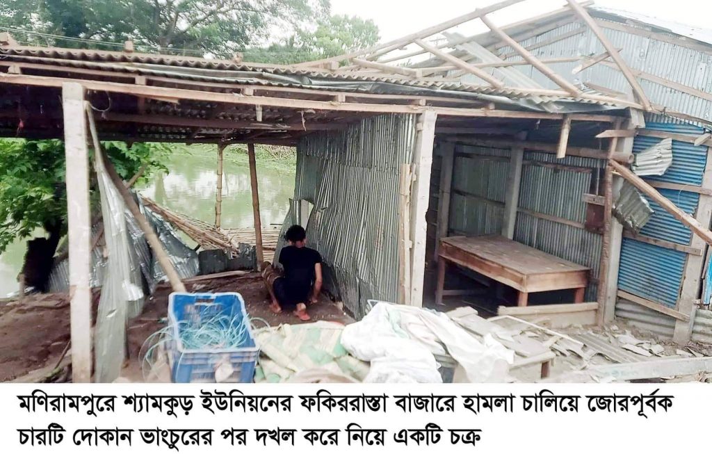 মণিরামপুরে শ্যামকুড় ইউনিয়নের ফকিররাস্তা বাজারে হামলা চালিয়ে শনিবার দিনে দুপুরে চারটি দোকান ভাংচুরের পর দখল করার অভিযোগ পাওয়া গেছে। দখলের সময় বাঁধা দিতে আসলে সন্ত্রাসীরা মারপিটে আহত করে তিন নারীসহ চার জনকে। খবর পেয়ে পুলিশ গিয়ে দখলকারীদের সেখান থেকে হটিয়ে দেয়। তবে অভিযোগ রয়েছে সন্ধ্যার দিকে আবারও দখল করা হয়। এ ব্যাপারে সাতজনের নাম উল্লেখসহ থানায় লিখিত অভিযোগ করা হলেও পুলিশ কাউকে আটক করতে পারেনি।