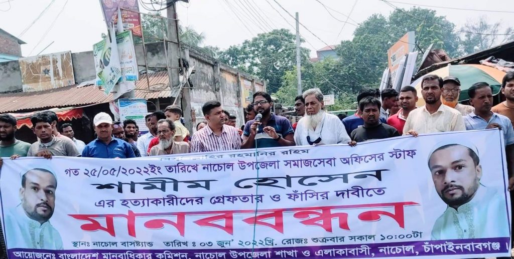 চাঁপাইনবাবগঞ্জের নাচোলে শামিম হত্যার প্রতিবাদে শান্তিপূর্ণ মানববন্ধন অনুষ্ঠিত হয়েছে। আজ শুক্রবার সকাল ১০টায় নাচোল বাসস্ট্যান্ড মোড়ে বাংলাদেশ মানবাধিকার কমিশন নাচোল উপজেলা শাখাসহ এলাকাবাসী এ মানববন্ধনে অংশগ্রহণ করেন।
