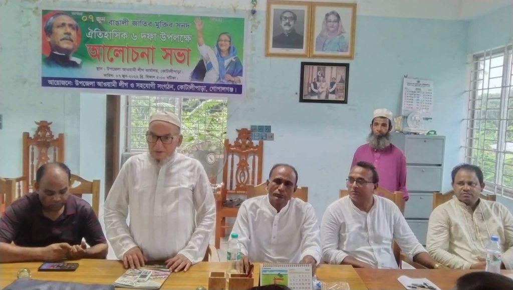 ৭ জুন বাঙালী জাতির মুক্তির সনদ ঐতিহাসিক ৬ দফা উপলক্ষে গোপালগঞ্জের কোটালীপাড়ায় আলোচনা সভা অনুষ্ঠিত হয়েছে। মঙ্গলবার বিকেলে উপজেলা আওয়ামীলীগ কার্যালয়ে এ সভার আয়োজন করেন উপজেলা আওয়ামীলীগ ও সহযোগী সংগঠন।