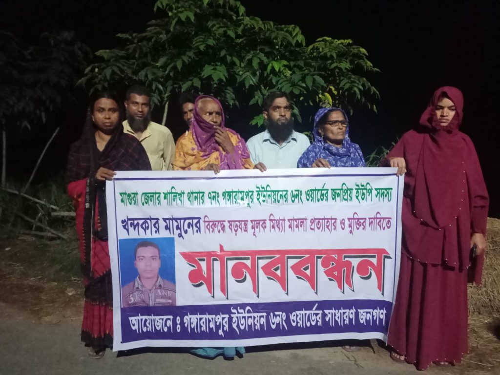 মিথ্যা মামলায় গ্রেফতারকৃত এলাকার জনপ্রিয় ইউপি সদস্য খন্দকার মামুনের মুক্তির দাবিতে আজ ৩ জুলাই রবিবার বিকাল ৫ টায় সাধারণ জনগণের পক্ষ থেকে মাগুরার শালিখার গঙ্গারামপুর ইউনিয়নের পুলুম গ্রামে মানববন্ধন করার চেষ্টা করা হলে শালিখা থানা পুলিশের পক্ষ থেকে নজিরবিহীন ভাবে বাধা প্রদান করা হয় এবং ভুক্তভুগি পরিবারের কয়েকজন সদস্যকে প্রহার করা হয় | পরে ভুক্তভুগীর পরিবারের পক্ষ থেকে রাতে অন্যত্র মানববন্ধন করা হয় |