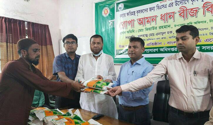 টাঙ্গাইলে বন্যায় ক্ষতিগ্রস্ত ২০০ কৃষকের মধ্যে কৃষি পুনর্বাসনের আওতায় দুই কেজি করে রোপা আমন ধানের বীজ বিতরণ করা হয়েছে।