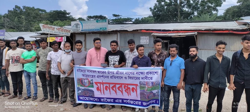 মাদারীপুরের রাজৈর উপজেলায়, রাজৈর সর্বস্তরের জনগণের আয়োজনে,২১ সেপ্টেম্বর ২০২২ ইং তারিখ, বুধবার, সকাল ১০: ঘটিকার সময়, রাজৈর বাস স্ট্যান্ড মহাসড়কের পাশে, জমি দখল নেয়া কে, কেন্দ্র করে, কলেজ ছাত্র, পারভেজ খানের, প্রননাশের লক্ষে আগ্নেয়াশ্র প্রদর্শনের প্রতিবাদের দাবীতে, মানববন্ধন অনুষ্ঠিত হয়।