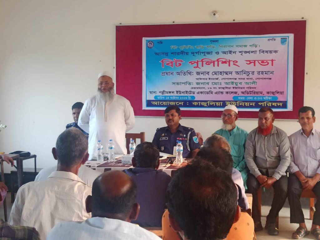 এই প্রতিপাদ্যকে সামনে রেখে গোপালগঞ্জ সদর থানাধীন ১৬নং কাজুলিয়া ইউনিয়নের পল্লীমঙ্গল ইউনাইটেড একাডেমি এন্ড কলেজ অডিটোরিয়ামে কাজুলিয়া ইউনিয়ন পরিষদ কর্তৃক আয়োজিত আসন্ন শারদীয় দূর্গাপূজা ও আইন শৃঙ্খলা বিষয়ক ‘বিট পুলিশিং সভা’ অনুষ্ঠিত হয়েছে।