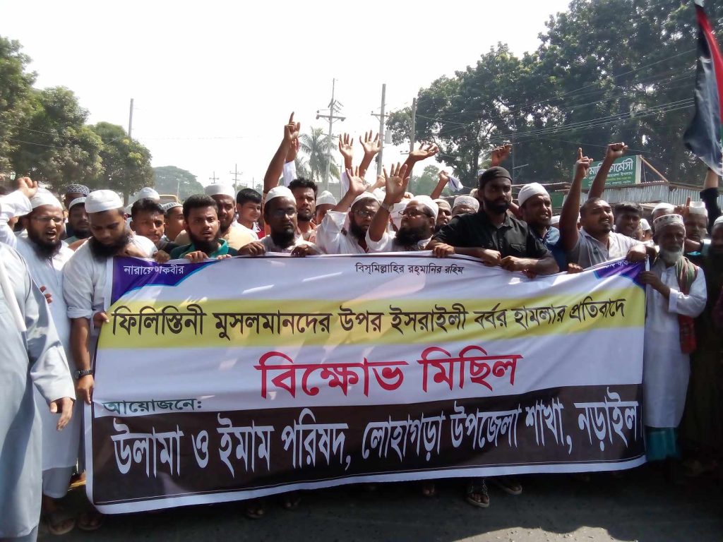 নড়াইলের লোহাগড়ায় ফিলিস্তিনি মুসলমানদের উপর ইসরায়েলি বর্বরোচিত হামলার প্রতিবাদে বিক্ষোভ মিছিল ও সমাবেশ অনুষ্ঠিত হয়েছে।