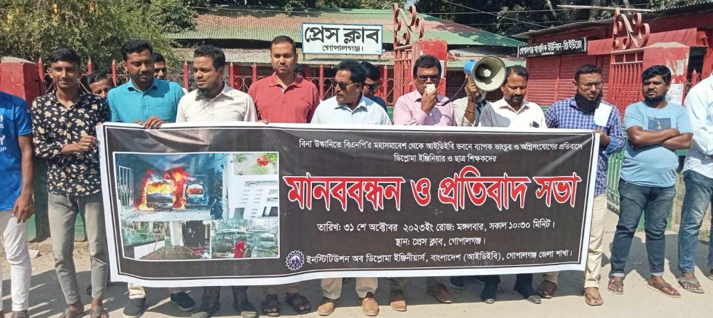 মঙ্গলবার (৩১ অক্টোবর) সকাল সাড়ে ১০ টায় গোপালগঞ্জ প্রেসক্লাবের সামনে ঘন্টাব্যাপী এ মানববন্ধন ও প্রতিবাদ সমাবেশ অনুষ্ঠিত হয়। ইনস্টিটিউশন অব ডিপ্লোমা ইঞ্জিনিয়ার্স বাংলাদেশ (আইডিবি) গোপালগঞ্জ জেলা শাখার আয়োজনে প্রতিবাদ সমাবেশে গোপালগঞ্জ আঞ্চলিক নির্বাহী কমিটির সভাপতি বি এম ইছানুল কবির, সাধারণ সম্পাদক মোঃ আবদুল হালিম খান সহ অন্যান্য নেতৃবৃন্দ বক্তব্য রাখেন।
