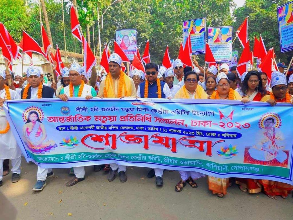 বর্ণাঢ্য শোভাযাত্রা ও আলোচনা সভার মধ্যদিয়ে আন্তর্জাতিক মতুয়া প্রতিনিধি সম্মেলন–২০২৩ অনুষ্ঠিত হয়েছে। এ লক্ষ্যে শনিবার (১১ নভেম্বর) বেলা ১১ টায় রাজধানীর ঢাকেশ্বরী মন্দিরের সামনে দেশ-বিদেশ থেকে আমন্ত্রিত সকল অতিথিবৃন্দ, নেতৃবৃন্দ, সাধু, গুরু- গোসাই বাবা মায়েদের স্বতঃস্ফূর্ত অংশগ্রহণে এক বর্ণাঢ্য শোভাযাত্রা বের হয়ে রাজধানীর বিভিন্ন গুরুত্বপূর্ণ সড়ক প্রদক্ষিণ শেষে পুনরায় ঢাকেশ্বরী মন্দিরের সামনে ফিরে শেষ হয়।