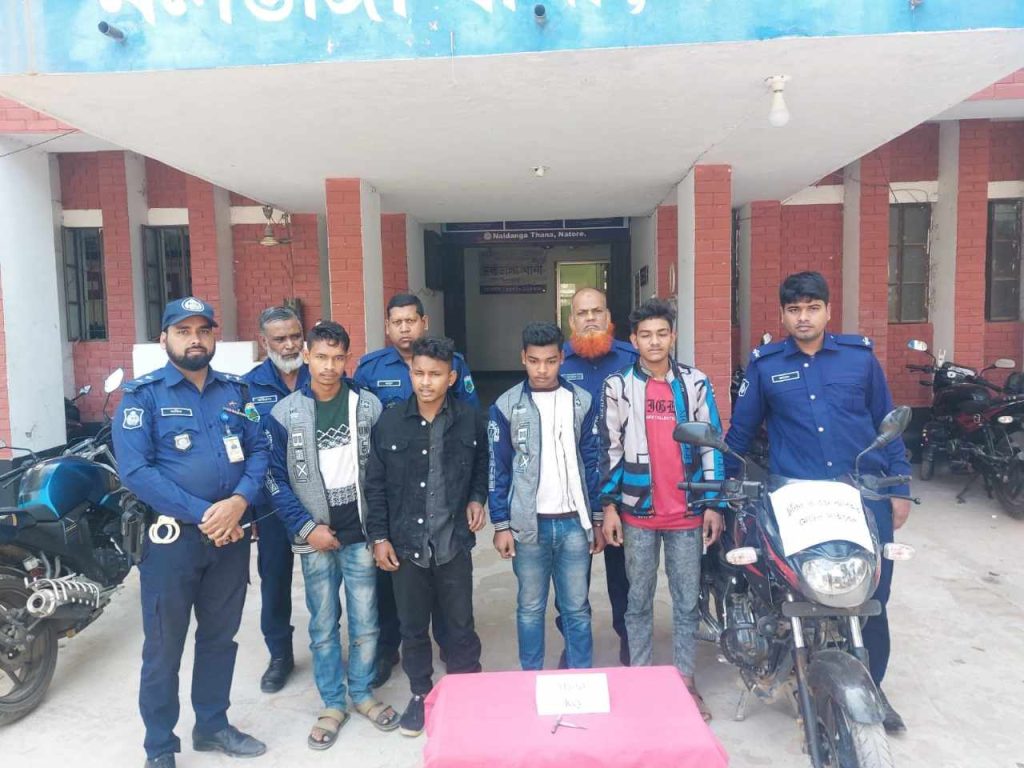 শনিবার (৩০ ডিসেম্বর) দুপুর ২টার দিকে নলডাঙ্গা থানা পুলিশের এক সংবাদ বিজ্ঞপ্তিতে এই তথ্য জানানো হয়। এরআগে শুক্রবার (২৯ ডিসেম্বর) সন্ধ্যা সাড়ে ৬টার সময় পুলিশের একটি চৌকস টীমের সমন্বয়ে থানা এলাকার বিভিন্ন পয়েন্টে পুলিশি চেক পোষ্ট বসিয়ে তাদের আটক করা হয়। আটককৃতরা হলো-জেলার নলডাঙ্গা উপজেলার হলুদঘর গ্রামের মোঃ সাইদুল ইসলাম কাজীর ছেলে মোঃ আবির ইসলাম (আবিদ) ও রবিউল (১৯) ও রুহুল আমীন (১৮), একই গ্রামের রাজু আহমেদের ছেলে শাকিল আহম্মেদ জীম (১৯) ও বগুড়ার আদমদিঘী উপজেলার মালসন গ্রামের মোস্তফার ছেলে মোঃ মোতালেব (২১)।