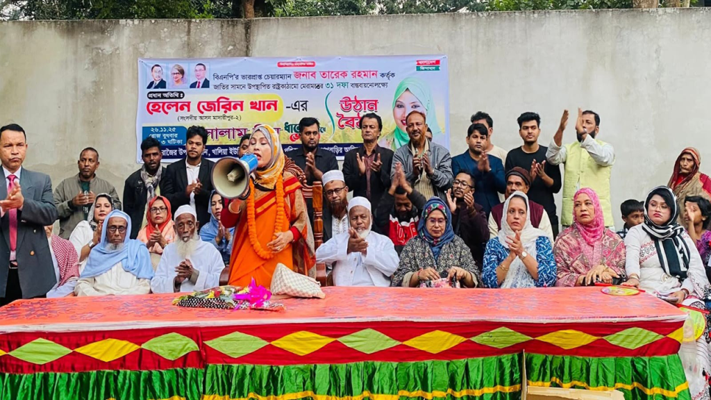 আজ ২৬ ডিসেম্বর ২০২৫ বুধবার বিকালে মাদারীপুরের রাজৈর উপজেলার পশ্চিম স্বরমঙ্গল গ্রামে শেখ বাড়িতে আগামীর রাষ্ট্রনায়ক জনাব তারেক রহমানের ৩১ দফা বাস্তবায়নে আয়োজিত এক উঠান বৈঠকে প্রধান অতিথি হিসেবে উপস্থিত ছিলেন মাদারীপুর – ২ সংসদীয় আসনে মনোনয়ন প্রার্থী বিএনপির কেন্দ্রীয় নির্বাহী কমিটির সহ শিক্ষা বিষয়ক সম্পাদক ও কেন্দ্রীয় মহিলা দলের সিনিয়র যুগ্ম সাধারণ সম্পাদক হেলেন জেরিন খান। অনুষ্ঠানে সভাপতিত্ব করেন রহম বেপারী।