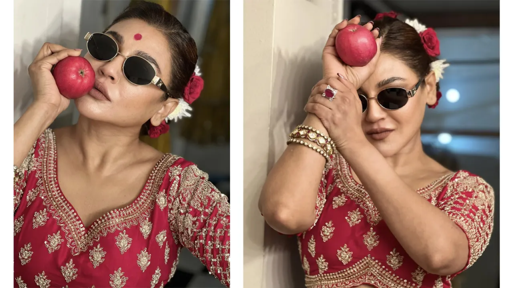 শেয়ার করা ছবিতে দেখা যাচ্ছে, তার কপালে লাল টিপ, মাথার খোঁপায় লাল-সাদা গোলাপ আর চোখে স্টাইলিশ রোদচশমা তাকে দিয়েছে এক অসাধারণ আভিজাত্যপূর্ণ লুক। হাতে পাথরের চুড়ি ও বালা পরা থাকলেও, এই পুরো সাজের সবচেয়ে বড় আকর্ষণ ছিল তার হাতে থাকা টুকটুকে লাল আপেল।