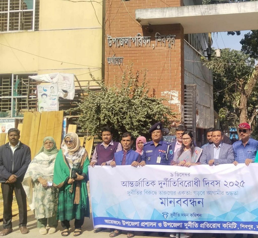 নরসিংদীর শিবপুর উপজেলায়, শিবপুর উপজেলা প্রশাসন ও উপজেলা দুর্নীতি প্রতিরোধ কমিটির আয়োজনে আন্তর্জাতিক দুর্নীতি বিরোধী দিবস উদযাপন করা হয়েছে। অদ্য ৯ ডিসেম্বর মঙ্গলবার সকালে এ দিবস উদযাপন করা হয়। দিবসটির শুরুতে উপজেলা পরিষদ মাঠে জাতীয় সংগীত এর মাধ্যমে জাতীয় পতাকা ও দুদক পতাকা উত্তোলন করা হয়। জাতীয় পতাকা ও দুদক পতাকা উত্তোলন করেন শিবপুর উপজেলা নির্বাহী অফিসার মোছাঃ ফারজানা ইয়াসমিন, সহকারী কমিশনার ভূমি মুঃ আবদুর রহিম ও শিবপুর উপজেলা দুর্নীতি প্রতিরোধ কমিটির সভাপতি নুর উদ্দিন মোঃ আলমগীর। পতাকা উত্তোলন শেষে মানববন্ধন উপজেলা সদরের প্রধান সড়কে অনুষ্ঠিত হয়। পতাকা উত্তোলন ও মানববন্ধন শেষে উপজেলা পরিষদ সভা কক্ষে আলোচনা সভা অনুষ্ঠিত হয়। উক্ত সভায় সভাপতিত্ব করেন শিবপুর উপজেলা দুর্নীতি প্রতিরোধ কমিটির সভাপতি ও শিবপুর সরকারি পাইলট মডেল উচ্চ বিদ্যালয় এর প্রধান শিক্ষক নুর উদ্দিন মোঃ আলমগীর। উক্ত অনুষ্ঠানে প্রধান অতিথির গুরুত্বপূর্ণ বক্তব্য রাখেন শিবপুর উপজেলা নির্বাহী অফিসার মোছাঃ ফারজানা ইয়াসমিন। অন্যান্যদের মধ্যে বক্তব্য রাখেন শিবপুর উপজেলা সহকারী কমিশনার (ভূমি) মুঃ আবদুর রহিম,শিবপুর মডেল থানার নবাগত অফিসার ইনচার্জ মোঃ কোহিনূর মিয়া প্রমুখ ।অনুষ্ঠান পরিচালনা করেন শিবপুর উপজেলা দুর্নীতি প্রতিরোধ কমিটির সাধারণ সম্পাদক ও লাখপুর শিমুলিয়া বালিকা উচ্চ বিদ্যালয় এর সহকারী শিক্ষক সাংবাদিক মোঃ আসাদুজ্জামান আসাদ। সভায় উপজেলার বিভিন্ন দপ্তরের প্রধানগন, উপজেলা দুর্নীতি প্রতিরোধ কমিটির সদস্যগন ও সাংবাদিকগন উপস্থিত ছিলেন। এ ছাড়াও শিবপুর মডেল থানার নবাগত অফিসার ইনচার্জ মোঃ কোহিনুর মিয়াকে ফুলেল শুভেচ্ছা জানান শিবপুর উপজেলা নির্বাহী অফিসার মোছাঃ ফারজানা ইয়াসমিন ও শিবপুর উপজেলা সহকারী কমিশনার (ভূমি) মুঃ আব্দুর রহিম। অদ্য দুপুরে শিবপুরে আন্তর্জাতিক নারী নির্যাতন প্রতিরোধ কক্ষ ও বেগম রোকেয়া দিবস ২০২৫ ইং উপলক্ষে অদম্য নারীদের কে সংবর্ধনা প্রদান করা হয়।