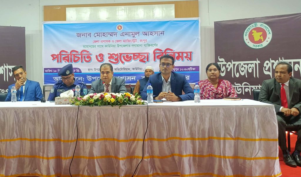 রংপুরের কাউনিয়ায় গণ্যমান্য ব্যক্তিদের সাথে নবাগত রংপুর জেলা প্রশাসক ও ও জেলা ম্যাজিস্ট্রেট মোহাম্মদ এনামুল আহসান এর মতবিনিময় করেন তিনি বলেন, নিরপেক্ষ ও প্রহণযোগ্য নির্বাচন নিশ্চিত করতে সবাইকে সৎ ও দায়িত্বশীল ভূমিকা পালন করতে হবে। একটি অবাধ, সুষ্ঠু ও গ্রহণযোগ্য নির্বাচন গণতন্ত্রের ভিত্তিকে শক্তিশালী করে। এজন্য প্রশাসন, জনপ্রতিনিধি, সাংবাদিক ও সুশীল সমাজের সম্মিলিত সহযোগিতা প্রয়োজন। নির্বাচনের সাথে সংশ্লিষ্ট সকল দপ্তরের কর্মকর্তা-কর্মচারীদের নিরপেক্ষতা ও সততার সঙ্গে দায়িত্ব পালনের আহ্বান জানান তিনি। মঙ্গলবার কাউনিয়া উপজেলা প্রশাসনের আয়োজনে উপজেলা অডিটরিয়ামে উপজেলার গণ্যমান্য ব্যক্তিবর্গের সাথে পরিচিতি ও মতবিনিময় সভায় তিনি এসব কথা বলেন। তিনি আরও বলেন সকলের ঐক্যবদ্ধ প্রচেষ্টায় কাউনিয়া উপজেলার সার্বিক উন্নয়ন কার্যক্রম আরও গতিশীল করা হবে। সহকারী কমিশনার (ভূমি) অংকন পাল এর সভাপতিত্বে উপজেলা যুব উন্নয়ন কর্মকর্তা সামসুজ্জামান আজাদ এর সঞ্চালনায় মতবিনিময় সভায় বক্তব্য রাখেন প্রাণিসম্পদ কর্মকর্তা ডাঃ এআরএম আল মামুন, কৃষি কর্মকর্তা তানিয়া আকতার, থানা অফিসার ইনচার্জ নজমুল হক, বীর মুক্তিযোদ্ধা হযরত আলী, প্রত্যাশার আলো পত্রিকার সম্পাদক ও প্রকাশক সারওয়ার আলম মুকুল, অধ্যক্ষ ফারুক আজম, সাংবাদিক সাইফুল ইসলাম, সাইদুর রহমান প্রমূখ। সভায় উপজেলার বিভিন্ন উন্নয়ন সমস্যা, নাগরিক সেবা, শিক্ষা, স্বাস্থ্য, কৃষি, প্রাণিসম্পদ, যোগাযোগ ব্যবস্থা এবং আইনশৃঙ্খলা পরিস্থিতি নিয়ে আলোচনা হয়। এ সময় গণ্যমান্য ব্যক্তিবর্গ তাদের নিজ নিজ এলাকার বিভিন্ন সমস্যা তুলে ধরেন এবং উন্নয়নের বিভিন্ন প্রস্তাব দেন। জেলা প্রশাসক আগামী ঈদের আগে কাউনিয়ায় একটি শিশু পার্ক নির্মানের প্রতিশ্রæতি দেন। মতবিনিময় সভায় বীর মুক্তিযোদ্ধা, জনপ্রতিনিধি, সাংবাদিক, শিক্ষক, ব্যবসায়ী ও সুশীল সমাজের প্রতিনিধিসহ উপজেলা প্রশাসনের বিভিন্ন দপ্তরের কর্মকর্তাবৃন্দ উপস্থিত ছিলেন।