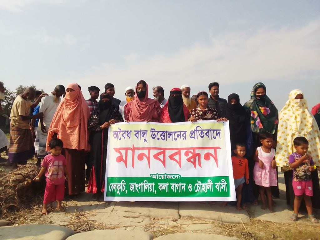 এই পরিস্থিতির প্রতিবাদে চৌহালি, জাঙ্গালিয়া, কলাবাগান ও বেলকুচি এলাকার প্রায় তিন শতাধিক নারী, পুরুষ, শিশু ও প্রবীণদের নিয়ে আয়োজন করা হয় মানববন্ধন। ব্যানার হাতে দাঁড়িয়ে ক্ষতিগ্রস্তরা জানালেন তাদের ক্ষোভ ও আতঙ্কের কথা।
