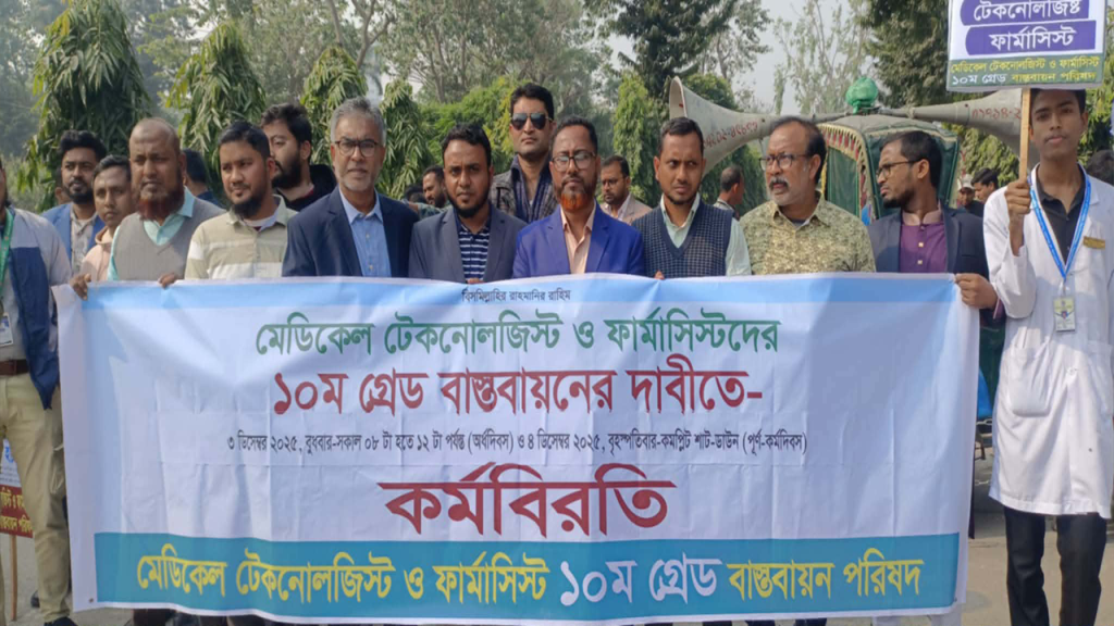 অন্যথায় আমরা পূর্ণাঙ্গ শাটডাউনে পড়ে কঠর আনন্দলনে যেতে বাধ্য হবো এবং তখন দেশের চিকিৎসা সেবা থমকে যাবে। দ্রুততম সময়ে সরকারের কাছে আমাদের দাবি—১০ম গ্রেড বাস্তবায়নে কার্যকর পদক্ষেপ নেওয়া হোক।” কর্মসূচিতে উপস্থিত ছিলেন মোঃ জহুরুল ইসলাম, সভাপতি, এম-ট্যাব, আঞ্চলিক জেলা কমিটি, রাজশাহী, অসীম কুমার ঘোষ, যুগ্মসচিব, এম-ট্যাব, কেন্দ্রীয় সংসদ, মোঃ রেজাউল করিম টুটুল, সদস্য, এম-ট্যাব, কেন্দ্রীয় সংসদ, মোঃ খোরশেদ আলম, সহ-সভাপতি, এম-ট্যাব, আঞ্চলিক জেলা কমিটি, রাজশাহী, মোঃ মিনহাজুল ইসলাম, সাংগঠনিক সম্পাদক, এম-ট্যাব, আঞ্চলিক জেলা কমিটি, রাজশাহী, সাঈদ আহমেদ বিদ্যুৎ, উপদেষ্টা মন্ডলীর সদস্য, এম-ট্যাব, আঞ্চলিক জেলা কমিটি, রাজশাহী, মোঃ মামুনুর রশীদ, সভাপতি, এমটিএফ, রাজশাহী, মোঃ সাইদুর রহমান, ফার্মাসিস্ট, রাজশাহী মেডিকেল কলেজ। এদিকে হঠাৎ এ কর্মবিরতির কারণে হাসপাতালে চিকিৎসা নিতে আসা সাধারণ রোগীরা ভোগান্তিতে পড়েন। জরুরি সেবা না পেয়ে কেউ কেউ ক্ষোভ প্রকাশ করেন। দ্রুত সমাধানের জন্য সরকারের হস্তক্ষেপ কামনা করেছেন রোগী ও স্বজনরা।