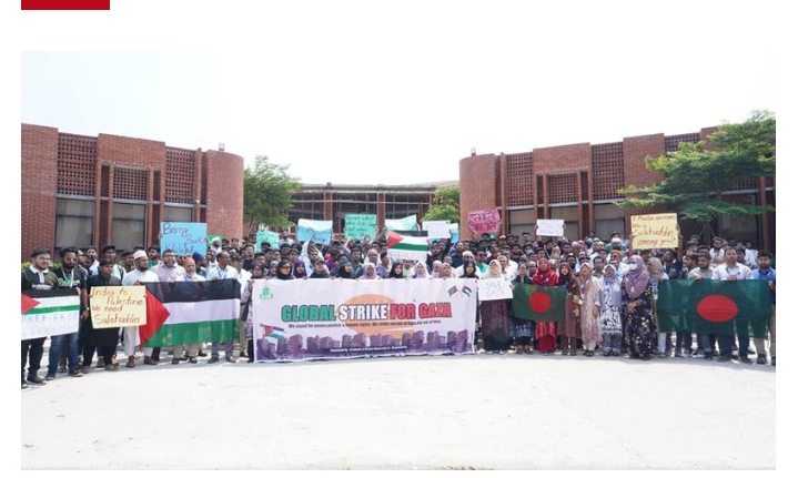 এ সময় উপস্থিত শিক্ষক-শিক্ষার্থীরা ‘বয়কট বয়কট, ইসরায়েল বয়কট’, ‘ফিলিস্তিন ফিলিস্তিন, জিন্দাবাদ জিন্দাবাদ’, ‘তুমি কে আমি কে, ফিলিস্তিন ফিলিস্তিন’ ইত্যাদি স্লোগান দিতে থাকেন।