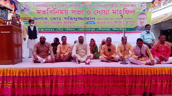 ঝিনাইদহ কোটচাঁদপুরে পৌর পরিষদের এক বছর বর্ষপূর্তি উদযাপন উপলক্ষে (২৮ শে- ফেব্রুয়ারী) সোমবার বিকালে মেইন- বাজার চত্বর পৌর যুবলীগের প্রধান কার্যালয়ের সামনে এক মতবিনিময় সভা ও দোয়া মাহফিল আয়োজন করা