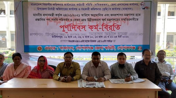 গোপালগঞ্জে পদোন্নতি ও গ্রেড পরিবর্তনসহ বেতন-ভাতা বৃদ্ধির দাবিতে জেলা-উপজেলায় আজ বুধবারও কর্মবিরতি কর্মসূচি পালন করেছে বাংলাদেশ কালেক্টরেট সহকারী সমিতি (বাকাসস)। জেলা প্রশাসকের কার্যালয়, উপজেলা নির্বাহী কর্মকর্তার কার্যালয় ও ভূমি কার্যালয়ে