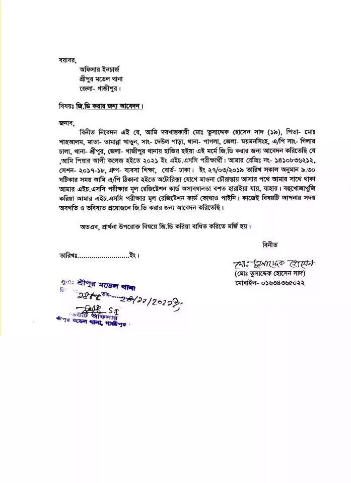 আমি মোঃ তুসাদ্দেক হোসেন সাদ (১৯) পিতাঃ মোঃ শাহআলম মাতাঃ তামান্না খাতুন গত ২৭/০৩/২০১৯ ইং তারিখে অটোরিকশা দিয়ে আসার সময় আমার সঙ্গে থাকা ২০১৭-১৮ সেশনের এইচ এস সি পরীক্ষার মূল রেজিস্ট্রেশন কার্ড অসাবধানতা বশত হারাইয়া যায়। যার রেজিঃ নং ১৪১০৮৩৬২১২ এব্যাপারে শ্রীপুর মডেল থানায় একটি সাধারণ ডায়েরি করা হয়েছে। ডায়েরি নং ১৪৮৫। তারিখঃ ২৪/১১/২০২১ —তুসাদ্দেক হোসেন সাদ