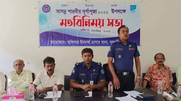 মাদারীপুরের ডাসারে আসন্ন শারদীয় দুর্গাপূজা উপলক্ষে ডাসার থানা পুলিশের উদ্যোগে এক মতবিনিময় সভা অনুষ্ঠিত হয়েছে। আজ বুধবার সকালে থানা ভবন হলরুমে এ সভা অনুষ্ঠিত হয়। ডাসার থানার অফিসার ইনচার্জ মোঃ